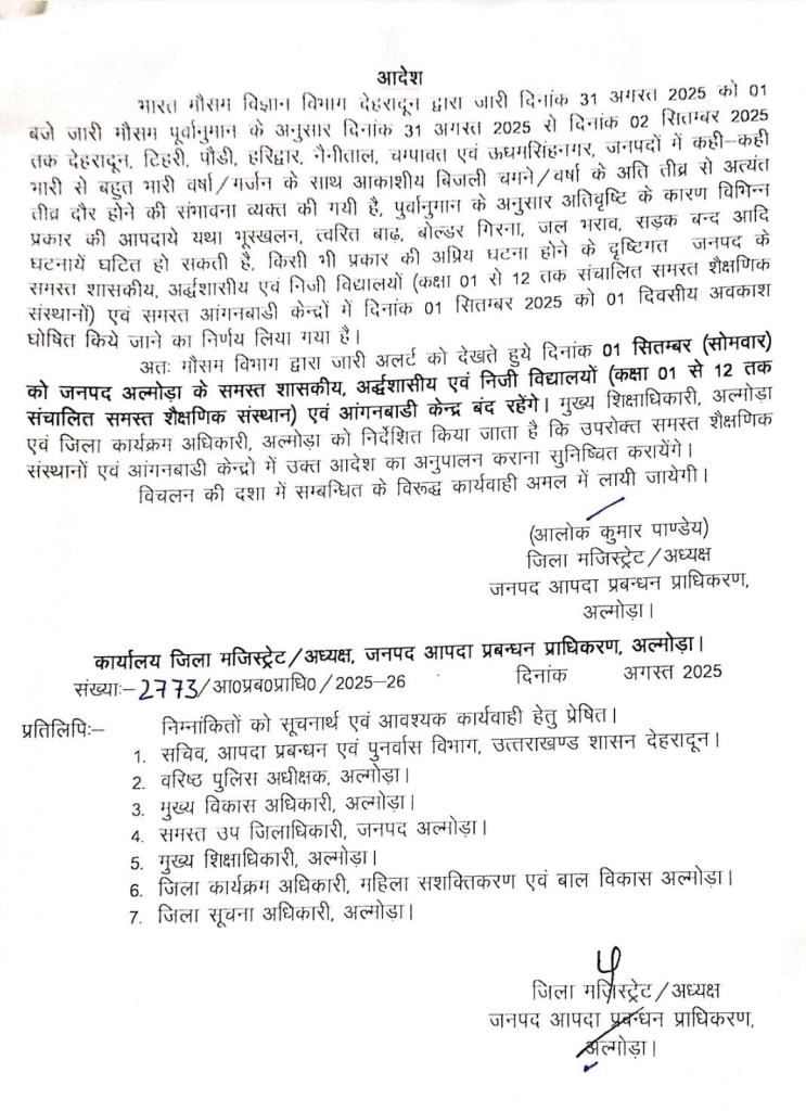 Almora मौसम विभाग द्वारा जारी अलर्ट को देखते हुए 01 सितंबर सोमवार को जनपद अल्मोड़ा के समस्त शासकीयएअर्धशासकीय एवे निजी विघ्यालय कक्षा 01 से 12 तक संचालित समस्त शैक्षणिक संस्थान एवं आंगनबाड़ी केंद्र बंद रहेंगे। इस संबंध मेंआदेश जिलाधिकारी अल्मोड़ा आलोक कुमार पांडे ने दिए हैं।