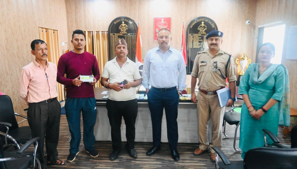 एसएसपी अल्मोड़ाद्वारा आज बरामद कीमती मोबाइलों को पुलिस कार्यालय अल्मोड़ा में उनके स्वामियों को सुपुर्द कर सभी को बधाई दी ।अपने खोये मोबाइल वापस पाकर सभी मोबाइल स्वामियों के चेहरे में खुशी झलक रही थी। उन्होंने कहा कि मोबाइल खोने पर वापस मिलने की उम्मीद खो चुके थे लेकिन अल्मोड़ा पुलिस पर विश्वास कायम था। पुलिस ने हमारे खोये फोन बरामद कर पुलिस के प्रति हमारे विश्वास को और अधिक बढ़ाया हैं। सभी ने अल्मोड़ा पुलिस के साईबर सेल टीम का आभार व्यक्त किया। पुलिस ने जनता से अपील की कि मोबाइल खोने पर तत्काल संचार साथी पोर्टल पर आम जनमानस भी स्वयं शिकायत दर्ज करा सकते है। साथ ही नजदीकी थाने या साइबर सेल को सूचित करें,जिससे आपके मोबाइल को रिकवर करने हेतु तत्काल कार्यवाही की जा सके।अल्मोड़ा सर्विलांस टीम जिनकी कडी मेहनत से यह सफलता पायी उनमें निरीक्षक भुवन जोशी, प्रभारी एसओजी, कानि0 चन्दन सिंह ,कानि0 हरीश प्रसाद,महिला कानि0 चम्पा दानू का सहयोग रहा।