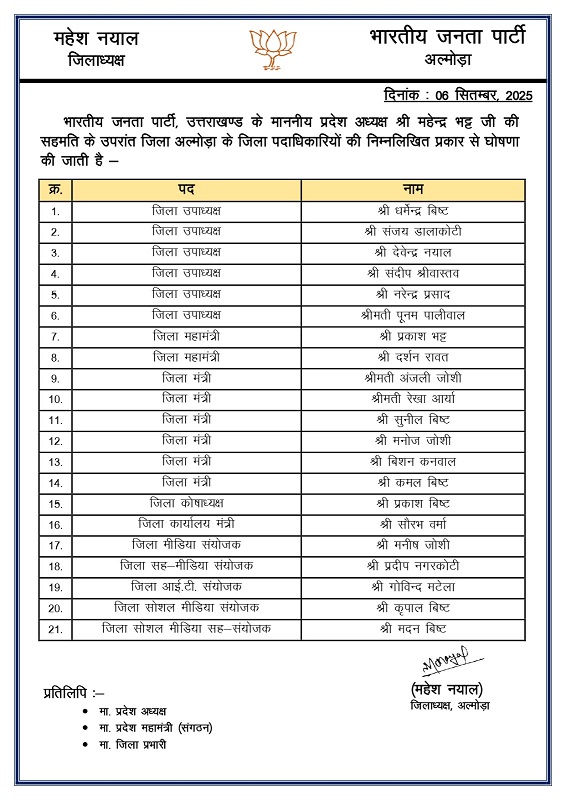 अल्मोड़ा भाजपा की जिला कार्यकारिणी घोषित