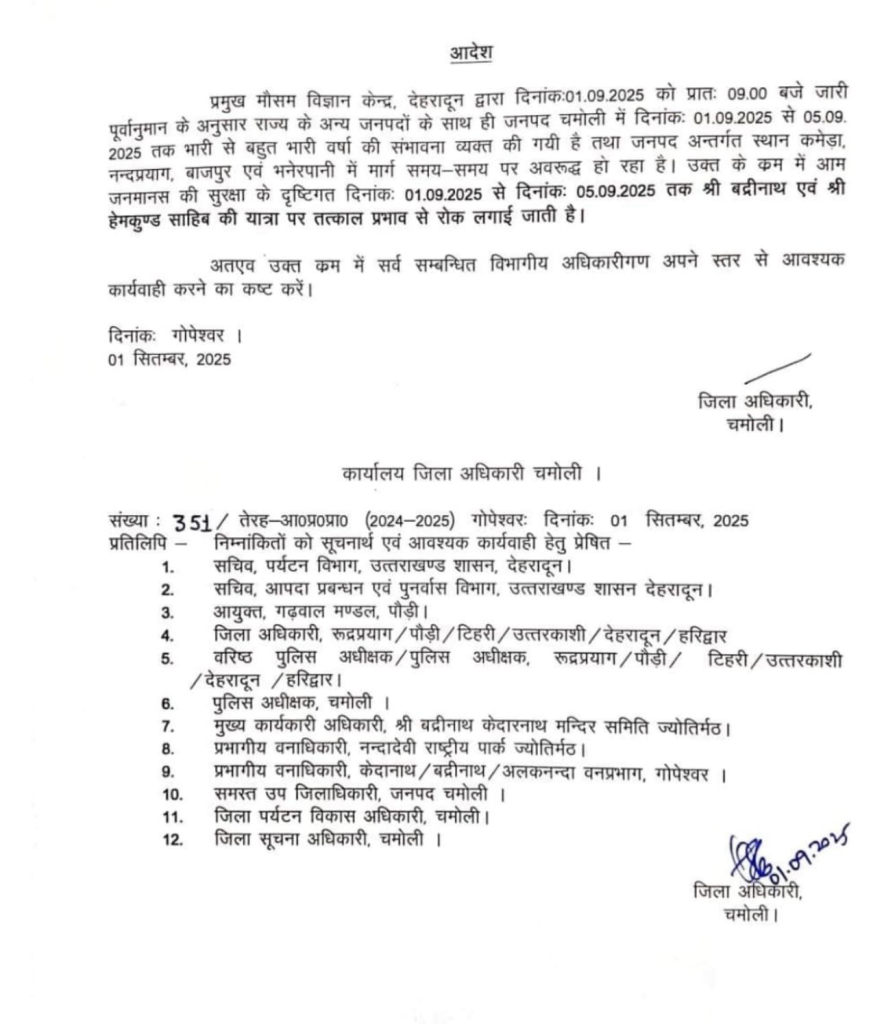 चमोली। उत्तराखण्ड मे जारी भारी बर्षात के कारण श्री बद्रीनाथ व श्री हेम कुण्ड साहिब की यात्रा 01सितम्बर से 05 सितम्बर तक स्थगित की गयी है । बताते चले कि चमोली जनपद में कमेड़ा,नन्दप्रयाग,बाजपुर एवं मनेरनपानी में मार्ग समय-समय में अवरू़द्ध हो रहा है। जिससे यात्रियों व जनमानष की सुरक्षा का खतरा पैदा हो रहा ह। जिसे देखते हुवे यह निर्णय जिलाधिकारी चमोली द्वारा लिया गया है।