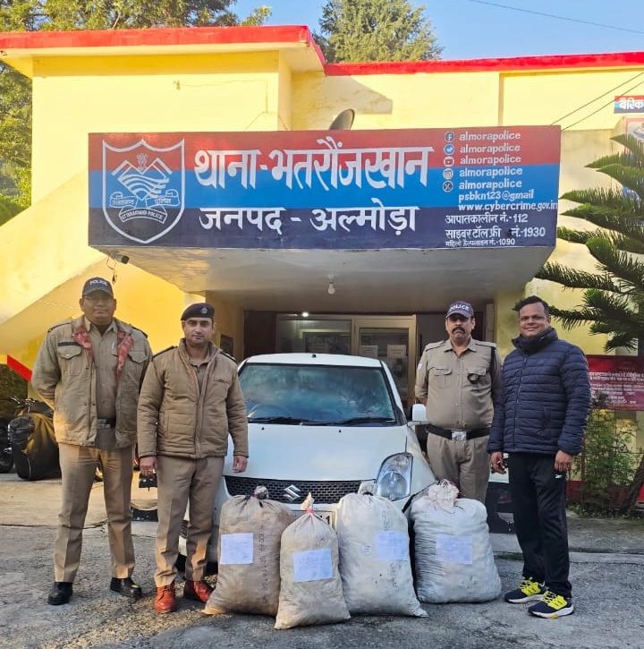 Almora-आज तड़के भतरौजखान पुलिस व एसओजी टीम चैकिंग कर रही थी। गांजे से से लदी कार तब पकड मे आयी जब निरीक्षक भुवन जोशी, प्रभारी एसओजी व थानाध्यक्ष भतरौजखान अवनीश कुमार के नेतृत्व में प्रभारी चौकी भिकियासैंण संजय जोशी मय पुलिस टीम व एसओजी की संयुक्त टीम द्वारा आज दिनांक 12.10.2025 की तड़के रामनगर रोड पीलीकोटी के पास चेकिंग की जा रही थी, इस दौरान वाहन संख्या- DL-5-CF-9911 स्विफ्ट कार को रुकने का इशारा किया गया तो चालक तेजी से कार को भगा ले गया शक होने पर पुलिस टीम ने कार का पीछा किया। चालक छोटी घट्टी तिराहे से 100 मी0 पहले कार को छोड़कर अंधेरे का फायदा उठाकर फरार हो गया। कार की तलाशी ली गई तो कार से 04 कट्टो में कुल 54.378 कि0लो0 अवैध गांजा बरामद हुआ। जिस पर अज्ञात फरार कार चालक के विरुद्ध थाना भतरौजखान में एनडीपीएस एक्ट के तहत एफआईआर पंजीकृत कर आवश्यक कार्यवाही की गई। फरार अभियुक्त की गिरफ्तारी के प्रयास किये जा रहे है।