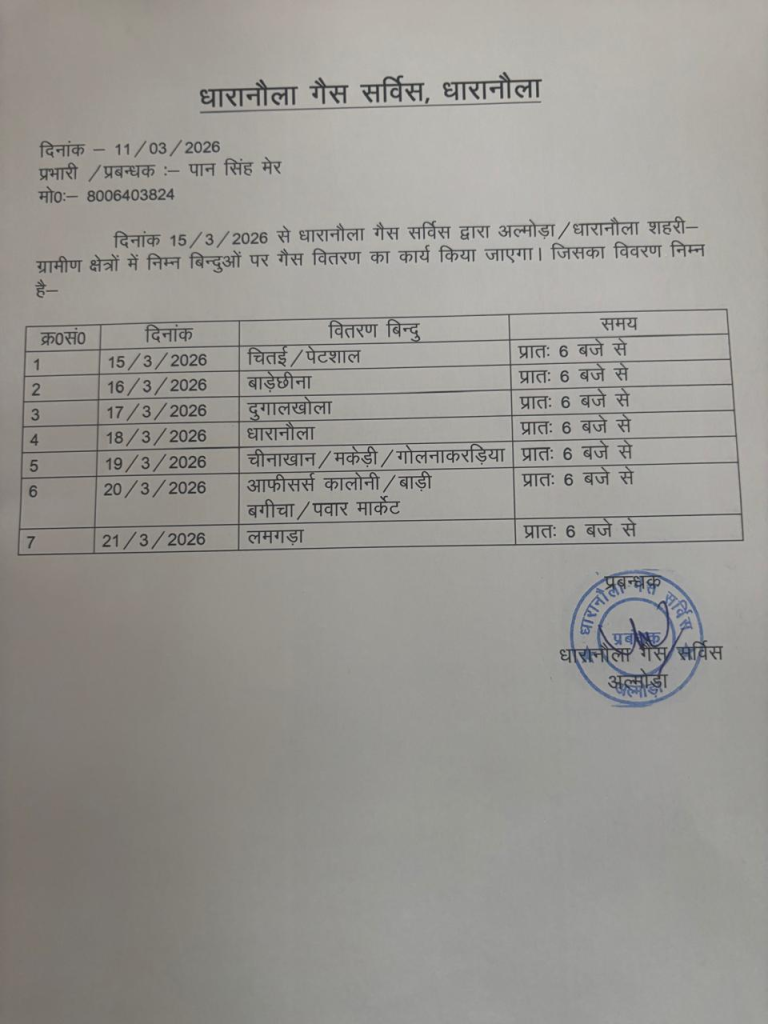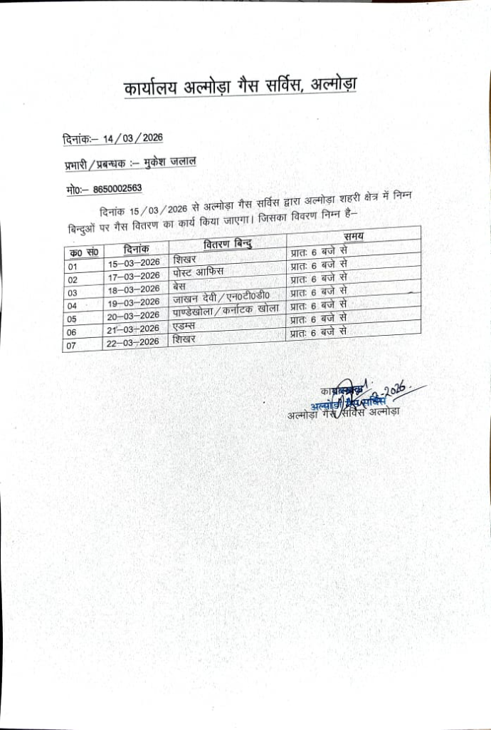 अल्मोड़ा, जनपद में गैस आपूर्ति व्यवस्था को सुचारु बनाए रखने के उद्देश्य से जिलाधिकारी अंशुल सिंह ने आवश्यक निर्देश जारी किए हैं। जारी आदेश के अनुसार वर्तमान वैश्विक परिस्थितियों के कारण गैस एजेंसियों में पर्याप्त मात्रा में गैस सिलेंडर उपलब्ध होने के बावजूद ऑनलाइन बुकिंग, आईवीआरएस एवं ओटीपी के माध्यम से गैस प्राप्त करने की प्रक्रिया प्रभावित हो रही है। इसके चलते उपभोक्ताओं को गैस प्राप्त करने में कठिनाई हो रही है तथा एजेंसियों में भीड़ की स्थिति उत्पन्न हो रही है।