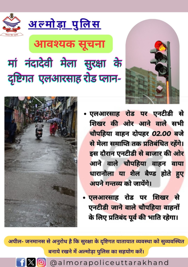 नंदादेवी मेले को देखते हुए पुलिस ने यातायात के लिये वाहनों की अवाजाही के लिये रूट प्लान जारी किया गया है।