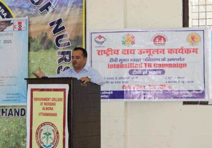Almora- राष्ट्रीय टी बी उन्मूलन कार्यक्रम के अंतर्गत प्रधानमंत्री टी बी मुक्त भारत अभियान के सफल संपादन हेतु उच्च जोख़िम समूह के नागरिकों का वर्तमान में गतिमान इंटेंसिफाइड टीबी कैंपिंग कार्यक्रम के अंतर्गत डिजिटल हैंड हेल्ड एक्सरे मशीन के माध्यम से टी बी की जांच किए जाने हेतु भारत सरकार द्वारा निर्देशित किया गया है जिसके क्रम में राजकीय नर्सिंग कॉलेज अल्मोड़ा में अध्यनरत छात्र छात्राओं के मध्य प्रचार प्रसार हेतु एक गोष्ठी कार्यक्रम आयोजित गया जिसमें उक्त संस्थान में अध्यनरत छात्र छात्राओं के डिजिटल हैंड