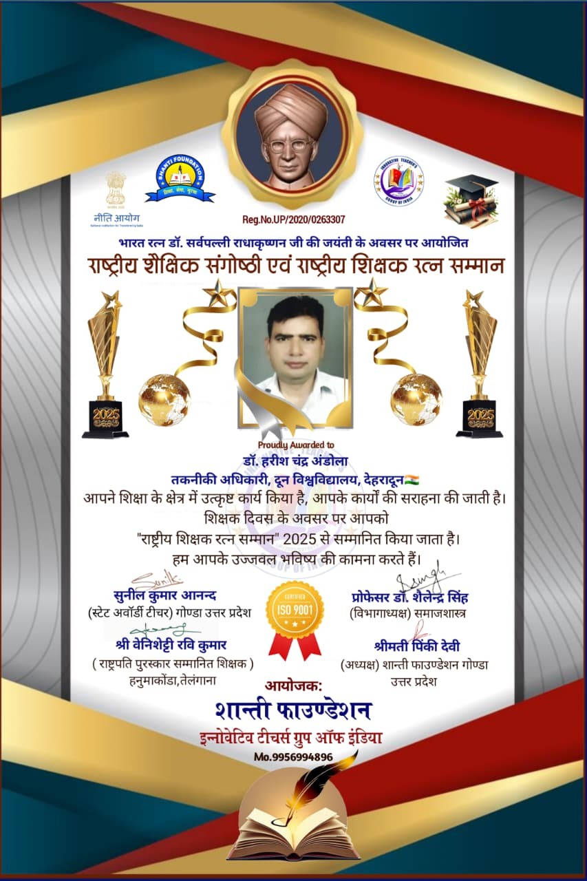 देहरादून -राष्ट्रीय शिक्षक दिवस पर दून विश्वविद्यालय के डॉ.हरीश चन्द्र अंडोला को विज्ञान इनोवेटिव के क्षेत्र में सराहनीय कार्य करने के लिए भाभा विज्ञान क्लब एवं शान्ति फाउंडेशन -गोंडा (उ.प्र.) द्वारा “इनोवेटिव टीचर दिवस पर 2025” से सम्मानित किया गया है। डॉ.अंडोला ने इस उपलब्धि को दून विश्वविद्यालय के कुलपति, कुलसचिव, पर्यावरण विभाग के प्राध्यापकों, सह कर्मियों व प्रो.एम एस एम रावत,निवर्तमान सलाहकार प्रो. के.डी.पुरोहित जी से ली गयी प्रेरणा का प्रतिफल बताया। डॉ.अंडोला द्वारा इस उपलब्धि का श्रेय उनके प्रत्यक्ष – अप्रत्यक्ष रुप से सहयोगी रहे सभी गुरुजनों व स्नेहीजनों को दिया है। पर्यावरण विभाग और दून के छात्र-छात्राओं को विश्वविद्यालय दिया गया.दून विश्वविद्यालय के कुलपति व कुलसचिव समेत सभी प्राध्यापकों का आभार व्यक्त किया गया। छात्र-छात्राओं के साथ क्षेत्रीय कार्यालय, उच्च शिक्षा के अधिकारी एवं कर्मचारियों के अतुलनीय सहयोग हेतु भी धन्यवाद व्यक्त किया गया।