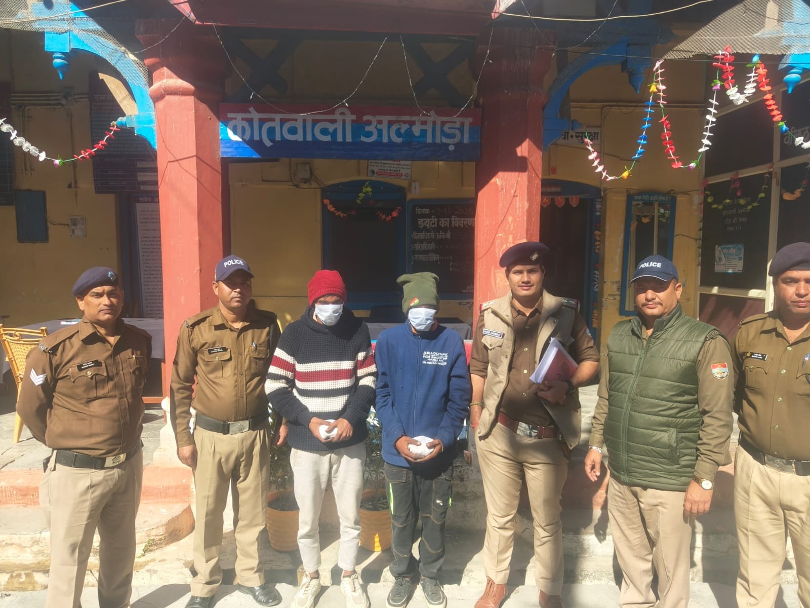 Almora सओजी और कोतवाली अल्मोड़ा पुलिस ने 656 ग्राम चरस के साथ 02 युवकों को गिरफ्तार किया प्राप्त जानकारी के अनुसार संयुक्त टीम द्वारा चेकिंग के दौरान फलसीमा से टाटिक हैलपैड की ओर पर मोटरसाइकिल संख्या-UP21-AL-3762 को चैक किया गया तो मो0सा0 में सवार दो युवक पंकज कुमार व मनोज कुमार के कब्जे से कुल 656 ग्राम अवैध चरस बरामद कर अभियुक्तों को गिरफ्तार करते हुए कोतवाली अल्मोड़ा में एनडीपीएस एक्ट के अन्तर्गत अभियोग पंजीकृत कर आवश्यक कार्यवाही की गई है। वाहन को सीज किया गया।बरामद चरस की कीमत- 1,31,200 रुपये आंकी गयी है।