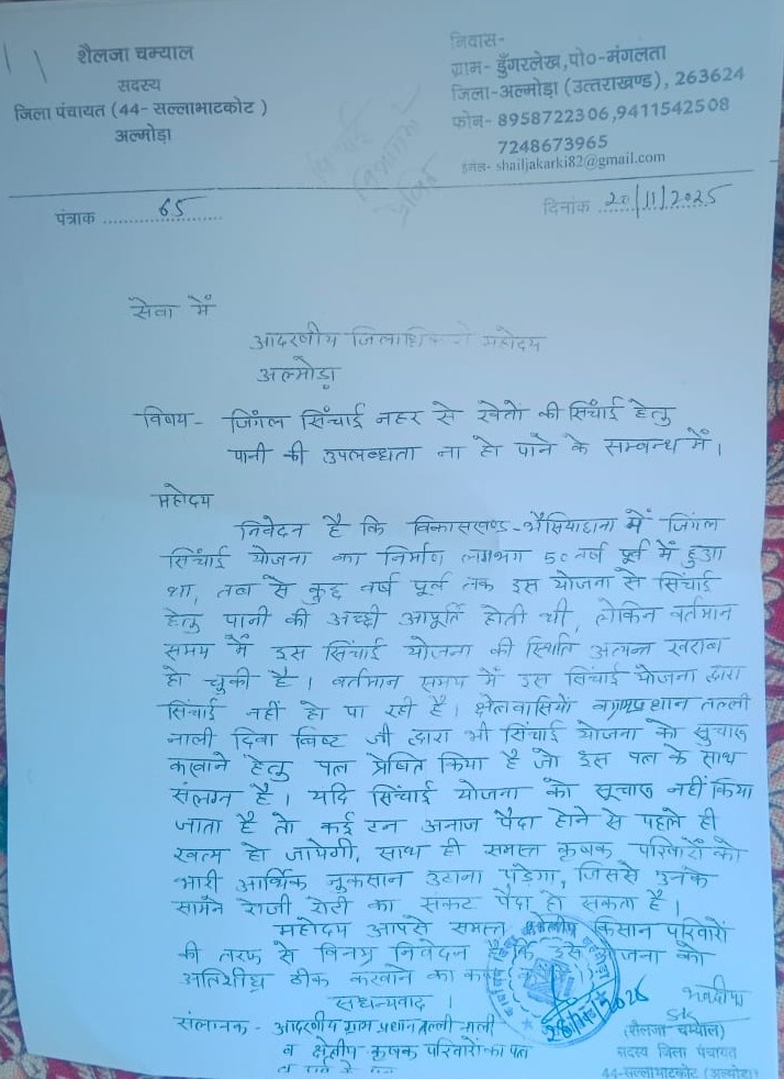 शैलजा चम्याल ने नाली जिंगल सिंचाई नहर जगह जगह ध्वस्त होने के संबंध में जिला अधिकारी को ज्ञापन सौंपा