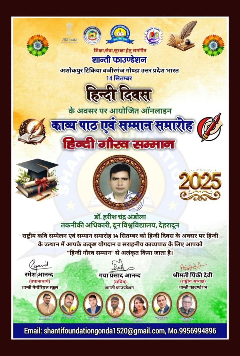 Dehradun=राष्ट्रीय हिंदी दिवस के अवसर पर दून विश्वविद्यालय के डॉ. हरीश चन्द्र अंडोला को हिंदी को विज्ञान के क्षेत्र में उल्लेखनीय योगदान के लिए “हिंदी दिवस पर 2025” से सम्मानित