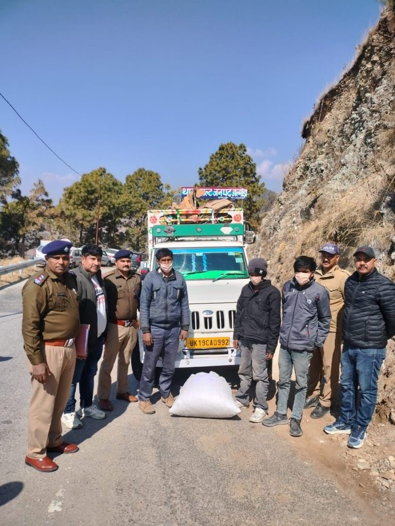 Almora-थाना सल्ट व एसओजी पुलिस टीम द्वारा संयुक्त चेकिंग के दौरान राजकीय आयुर्वेदिक चिकित्सालय के पास एक कबाड़ से भरी पिकअप वाहन सं0- UK19-CA-0992 को चेक करने पर सवार 03