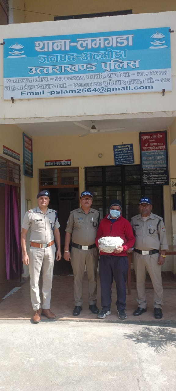 Almora-अल्मोड़ा पुलिस लगातार नशे के विरूद्ध कार्यवाही कर रही है। कल गांजे के साथ एक तस्कर को गिरफ्तार किया वही कल ही एक और सफलता प्राप्त हुयी जब 2.5 किलोग्राम की चरस बरामद करने में कामयाबी पायी है। प्राप्त जानकारी के अनुसार अपर पुलिस अधीक्षक हरबन्स सिंह व सीओ अल्मोड़ा गोपाल दत्त जोशी के पर्यवेक्षण में निरीक्षक भुवन जोशी,प्रभारी एसओजी व थानाध्यक्ष लमगड़ा प्रमोद पाठक के नेतृत्व में संयुक्त टीम द्वारा लमगड़ा रोड जय जागेश्वर मिष्ठान भण्डार के पास चेकिंग के दौरान एक व्यक्ति ललित पाण्डे के कब्जे से 2.532 किलोग्राम चरस कीमत. 5,06,400 रुपये बरामद कर अभियुक्त को गिरफ्तार करते हुए थाना लमगड़ा में एफआईआर कर एनडीपीएस एक्ट के अन्तर्गत अभियोग पंजीकृत कर कार्यवाही की गई है।इस बरामदी पर सएसपी अल्मोड़ा द्वारा पुलिस टीम को 5,000 रुपये के नगद पुरस्कार से पुरस्कृत किया गया है। इस बरामदगी में पुलिस के उ0नि0 नरेश कोहली,चौकी प्रभारी मोरनौला, हेड कानि0 त्रिलोकनाथ गोस्वामी,थाना लमगड़ा,कानि0 राकेश भट्ट,एसओजी अल्मोड़ा कानि0 चन्दन सिंह,एसओजी अल्मोड़ाकानि0 इरशाद उल्ला एसओजी,अल्मोड़ाकानि0 केशव भौंत,थाना लमगड़ा सामिल थे।