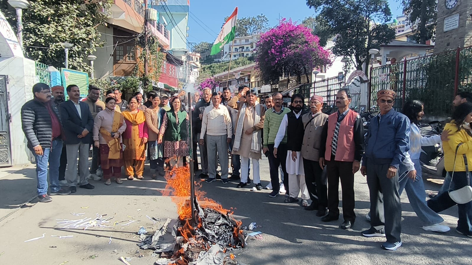 जिला कांग्रेस कमेटी अल्मोड़ा के तत्वाधान मे कर्मचारियों पर एस्मा लगाने के विरोध मे धामी सरकार का पुतला दहन किया