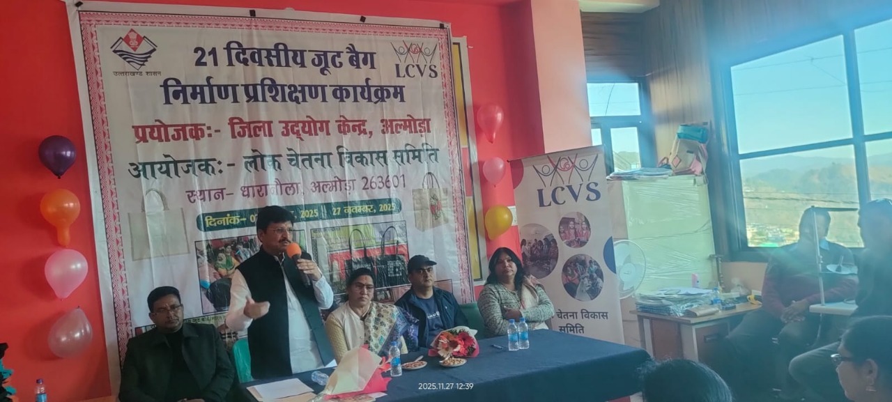 Almora-लोक चेतना विकास समिति द्वारा आयोजित तथा जिला उद्योग केंद्र, अल्मोड़ा द्वारा प्रायोजित इक्कीस दिवसीय जूट थैला प्रशिक्षण कार्यक्रम का आज ( Dated 27-11-2025) सफलतापूर्वक समापन किया गया। यह प्रशिक्षण समिति के जूट प्रशिक्षण केंद्र, धारानौला राजपुर, अल्मोड़ा में संचालित किया गया, जिसमें कुल पच्चीस प्रशिक्षणार्थिनियों ने भाग लिया।